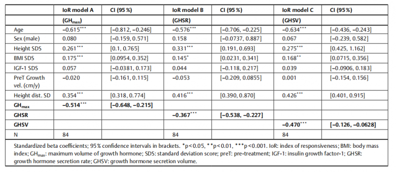 在3个预测模型中,年龄、Height dist. SDS均是GH治疗1年后IoR的最佳预测因子。GH分泌参数中,GHmax是IoR的最佳预测因子(β coef = - 0.514,p < 0.001),其次是GHSV(β coeff = - 0.470,p < 0.001)和GHSR(β coef = - 0.367,p < 0.001)。结合GHmax与Height dist. SDS的新参数(GHmax × Height dist. SDS)能够提升预测效能(β = - 0.68),有望解释IoR变异性的68%。