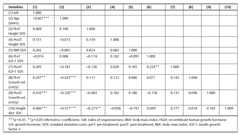 IoR与年龄呈显著负相关(r = - 0.607,p < 0.01),与Height dist. SDS呈显著正相关(r = 0.466,p < 0.01),与治疗前生长速率呈显著正相关(r = 0.247,p < 0.05)。IoR与治疗前后IGF-1 SDS无显著相关性(r = - 0.074和0.205,p >0.05)。