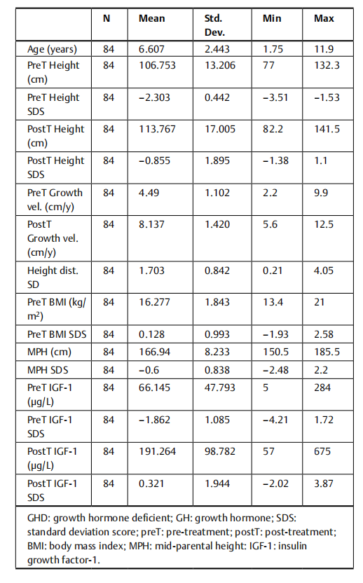 共84例青春期前IGHD儿童纳入本研究,男性47例、女性37例,平均年龄6.6岁。治疗前身高SDS为 - 2.303,治疗前身高和父母身高中值(MPH)差距的标准差积分(Height dist. SDS)为1.703。其余参数见表1。