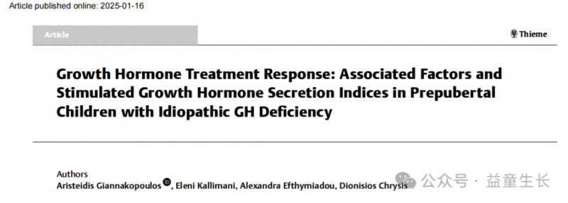 Giannakopoulos A, Kallimani E, Efthymiadou A, et al. Growth Hormone Treatment Response: Associated Factors and Stimulated Growth Hormone Secretion Indices in Prepubertal Children with Idiopathic GH Deficiency[J]. Experimental and clinical endocrinology & diabetes. 2025,133(1):34-39.