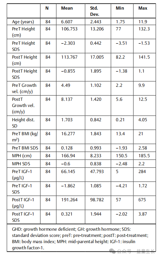 共84例青春期前IGHD儿童纳入本研究,男性47例、女性37例,平均年龄6.6岁。治疗前身高SDS为 - 2.303,治疗前身高和父母身高中值(MPH)差距的标准差积分(Height dist. SDS)为1.703。其余参数见表1。