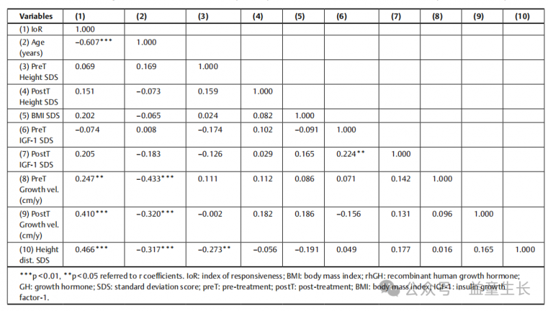 IoR与年龄呈显著负相关(r = - 0.607,p < 0.01),与Height dist. SDS呈显著正相关(r = 0.466,p < 0.01),与治疗前生长速率呈显著正相关(r = 0.247,p < 0.05)。IoR与治疗前后IGF-1 SDS无显著相关性(r = - 0.074和0.205,p >0.05)。