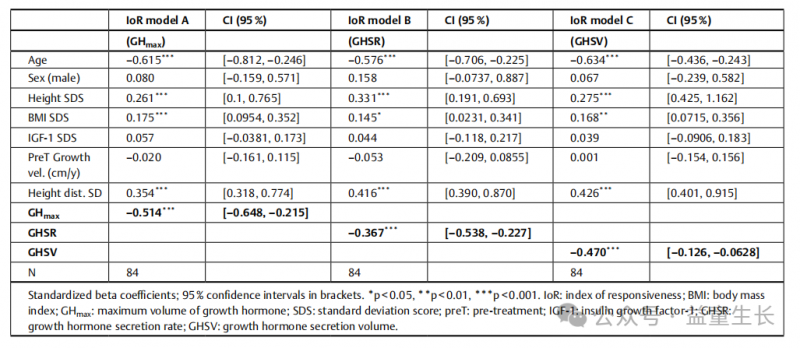 在3个预测模型中,年龄、Height dist. SDS均是GH治疗1年后IoR的最佳预测因子。GH分泌参数中,GHmax是IoR的最佳预测因子(β coef = - 0.514,p < 0.001),其次是GHSV(β coeff = - 0.470,p < 0.001)和GHSR(β coef = - 0.367,p < 0.001)。结合GHmax与Height dist. SDS的新参数(GHmax × Height dist. SDS)能够提升预测效能(β = - 0.68),有望解释IoR变异性的68%。