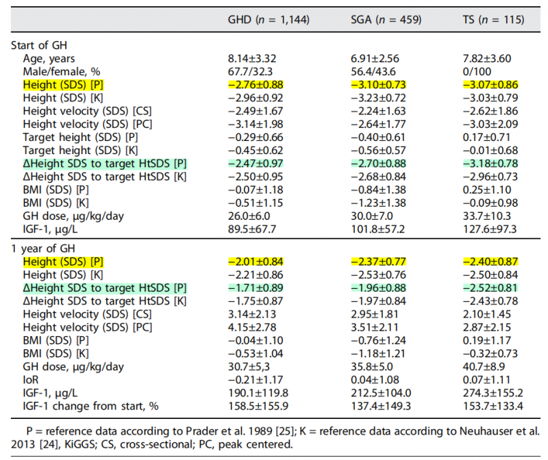 ● SGA患者:GH治疗平均起始剂量为30.0 µg/kg/d,低于推荐剂量(35.0 µg/kg/d),治疗1年后增加到35.7 µg/kg/d。