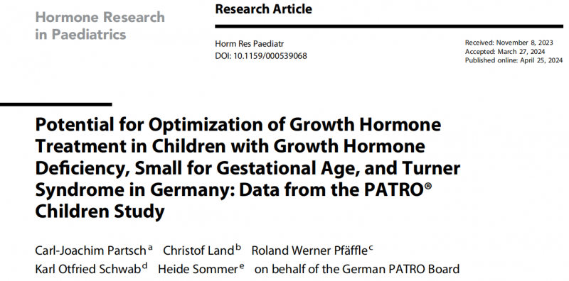 Partsch CJ, Land C, Pfäffle RW, et al. Potential for Optimization of Growth Hormone Treatment in Children with Growth Hormone Deficiency, Small for Gestational Age, and Turner Syndrome in Germany: Data from the PATRO® Children Study. Horm Res Paediatr. Published online April 25, 2024.