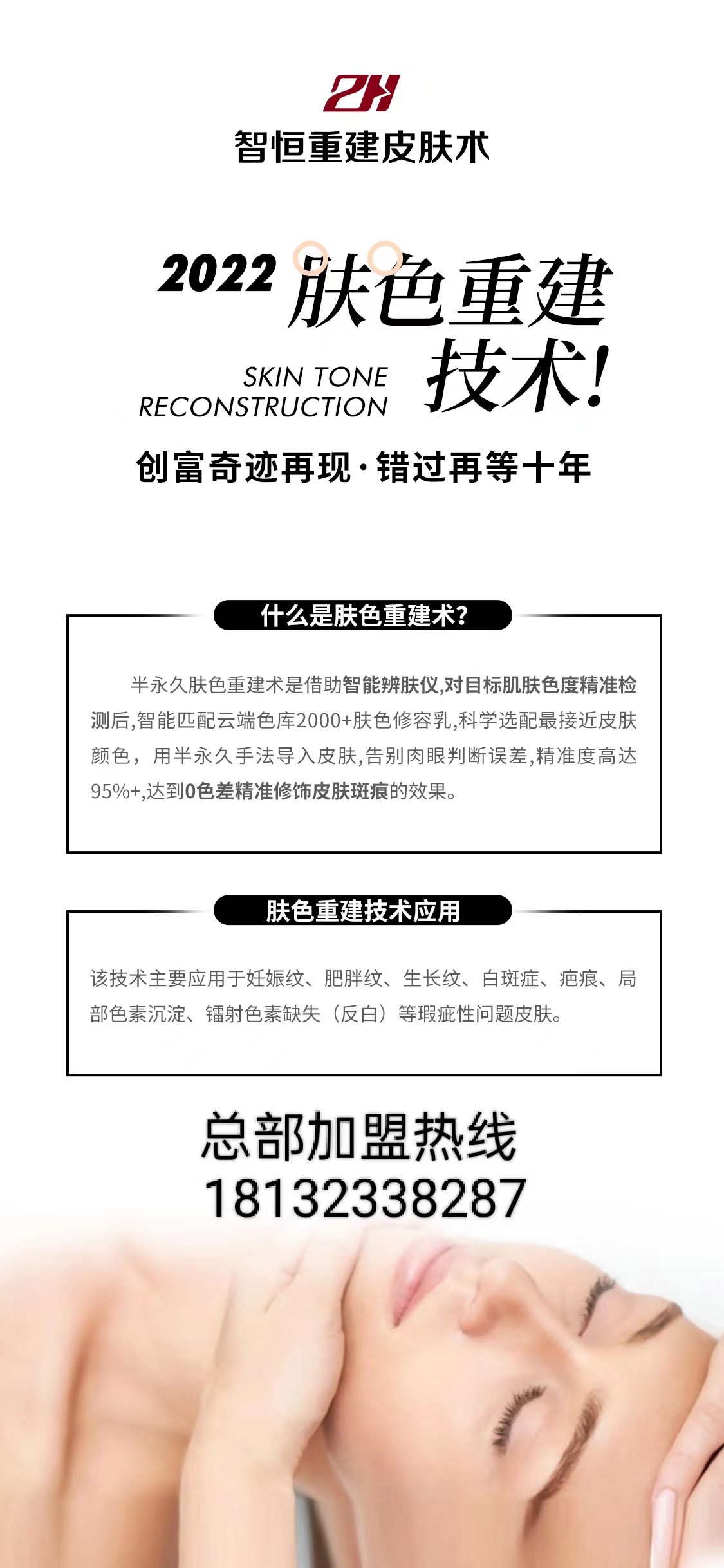 智恒重建皮肤术是借助AI智能科技测色,对目标肌肤色度精准检测后,智能匹配云端色库2000+种颜色比对系统精准配色,科学选配*接近皮肤颜色,用半永久手法导入皮肤,告别肉眼判断误差,精准度高达99%,解决妊娠纹、肥胖纹、生长纹、白斑症、疤痕、局部色素沉淀、镭射色素缺失(反白)等瑕疵性问题皮肤,达到精准修饰的效果。