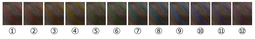 让原发色为自然棕※1的女性分别使用红色系、蓝绿色系、紫色系等12种不同色彩(图1)进行局部挑染后逐一拍摄照片,并将全部12帧照片(图2)供10位20-29岁的女性观察。然后要求观察者对这些照片中的发色造型的观感进行评分。观感的描述分为“女人味”、“可爱感”、“时尚感”、“奢华感”※2。“毫无此感”为0分,“非常贴切”为100分。(Visual Analogue Scale法,亦即视觉模拟量表法)。