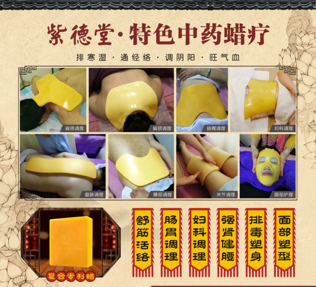 紫德堂特色中药蜡疗,从古方、创新法,研制当代美容利器”蜡女郎“复合专利蜡膜,将中医与现代萃取工艺完美结合,真正做到:排寒湿、通经络、调阴阳、旺气血。