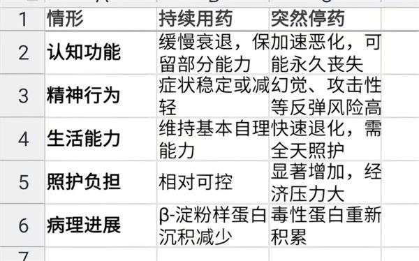 一旦停药,失去药物对病理进程的抑制作用,疾病可能快速进展。临床案例显示,持续用药40个月的患者虽仍存在记忆障碍,但保留了部分长期记忆和生活能力(如回忆歌曲、参与家务);若停药,可能加速丧失现有功能,导致认知、行为症状恶化。部分患者对传统药物(如胆碱酯酶抑制剂)耐受性差或无效,甘露特钠可能是少数有效的选择。停药后若病情反弹,重新用药可能无法恢复至原状态